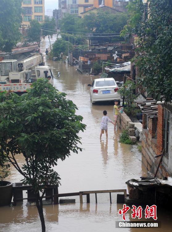 7月9日13时45分,今年第1号台风“尼伯特”以强热带风暴级在福建石狮沿海登陆,中心最大风力10级(25米/秒)。受其影响,福建中部沿海地区发生暴雨到大暴雨,局部特大暴雨,造成莆田、闽清、永泰等多地内涝严重。图为受淹的莆田市区内,小朋友在家门口戏水。 中新社记者 吕明 摄