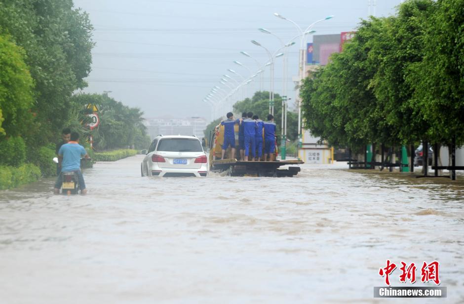 7月9日13时45分,今年第1号台风“尼伯特”以强热带风暴级在福建石狮沿海登陆,中心最大风力10级(25米/秒)。受其影响,福建中部沿海地区发生暴雨到大暴雨,局部特大暴雨,造成莆田、闽清、永泰等多地内涝严重。图为莆田市区民众把抛锚的汽车推出积水路段。 中新社记者 吕明 摄