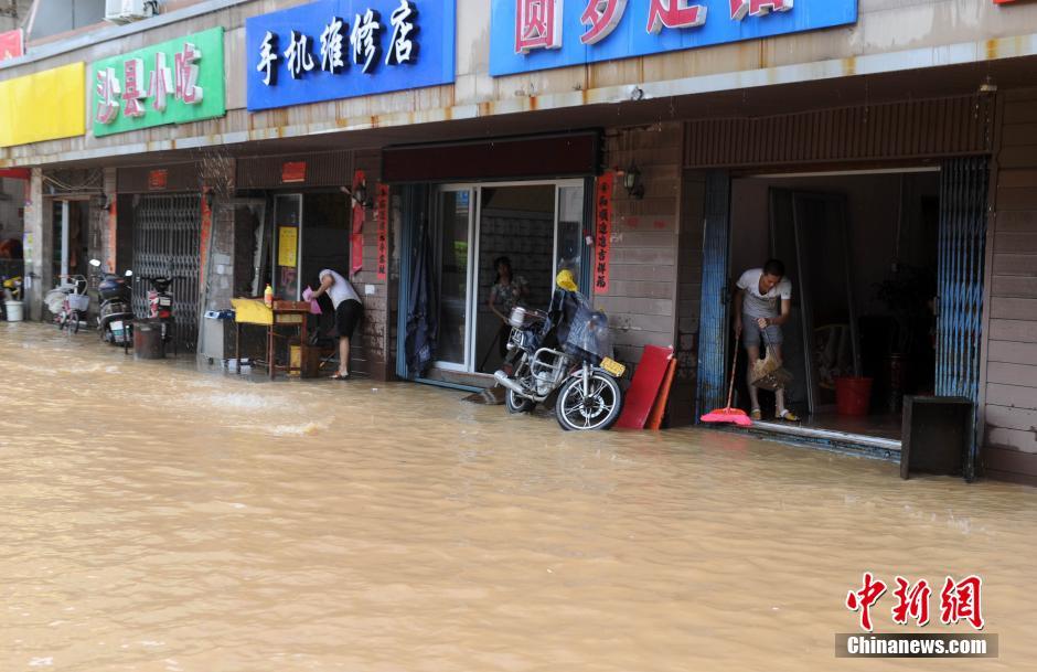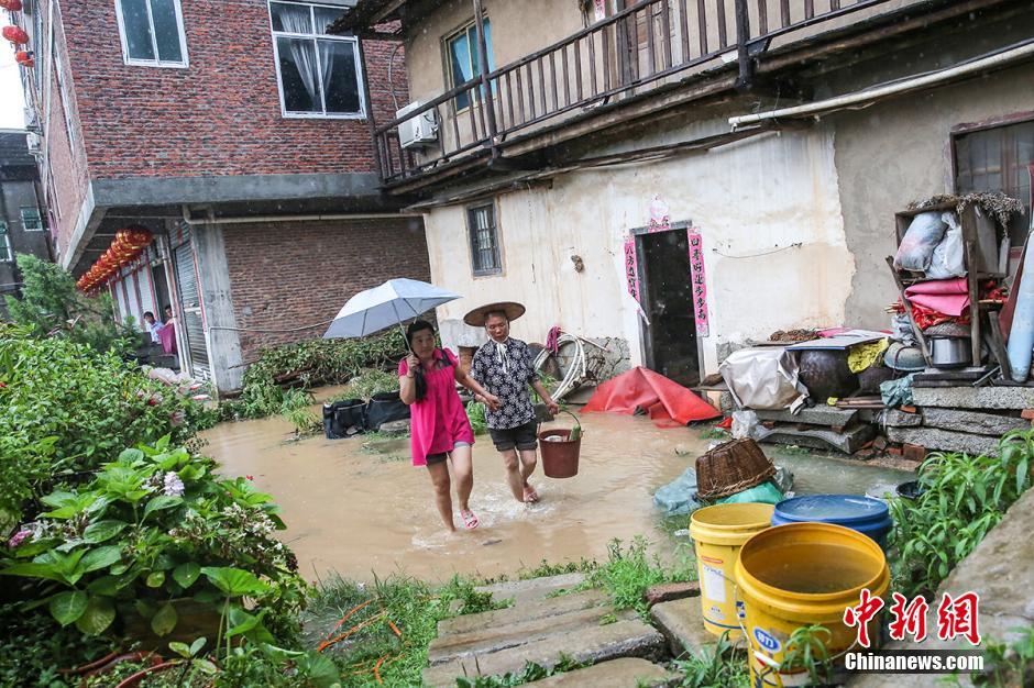 7月9日13时45分,今年第1号台风“尼伯特”以强热带风暴级在福建石狮沿海登陆,中心最大风力10级(25米/秒)。受其影响,福建中部沿海地区发生暴雨到大暴雨,局部特大暴雨,造成莆田、闽清、永泰等多地内涝严重。图为莆田市区受灾民众在清理家中积水。 中新社记者 吕明 摄