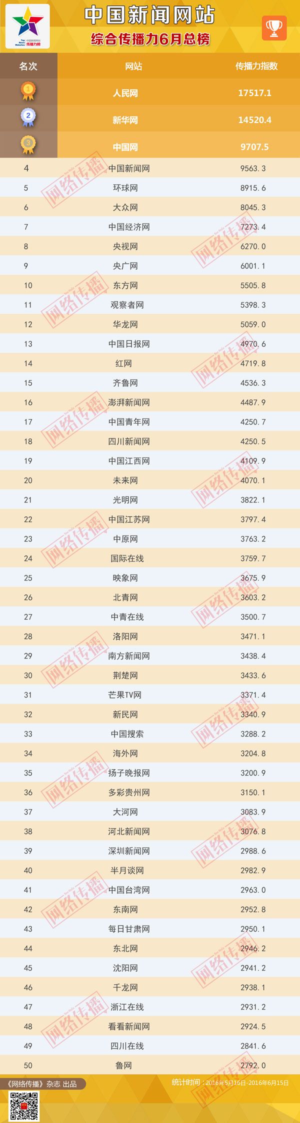 中央网信办《网络传播》杂志倾力打造的“中国新闻网站传播力2016年6月总榜”今日正式发布。