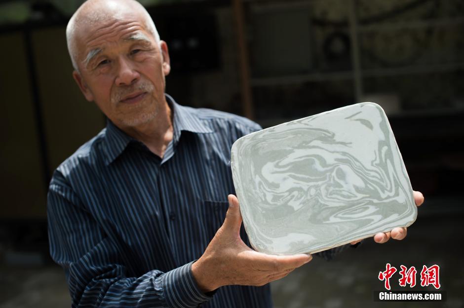 8月10日,山西太原孟家井村,从明代便失传的孟家井窑绞胎瓷带着130度的余温出窑,这是当地历经8年研究、复原古法技艺后,首次大批量烧制绞胎瓷。太原市美术馆馆长王鼎介绍说,根据史料记载,孟家井窑创烧于宋代,元、明为其鼎盛期,至清代产量减少,民国仍在烧制。但绞胎瓷从明代之后就再无踪迹,从出土的文物和史料记载中看,绞胎瓷已经失传了将近400多年。图为太原孟家井村的第三代烧瓷人76岁的冀田福展示刚出窑的绞胎瓷。 中新社记者 武俊杰 摄
