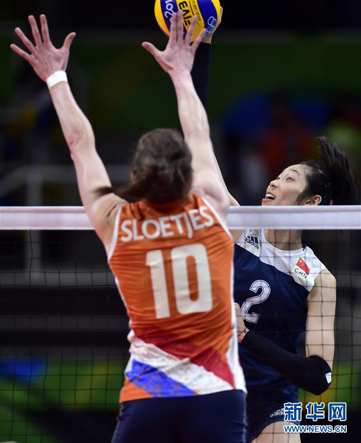 8月18日,中国队球员朱婷(右)在比赛中扣球。 当日,在2016年里约奥运会女子排球半决赛中,中国队对阵荷兰队。 新华社记者岳月伟摄