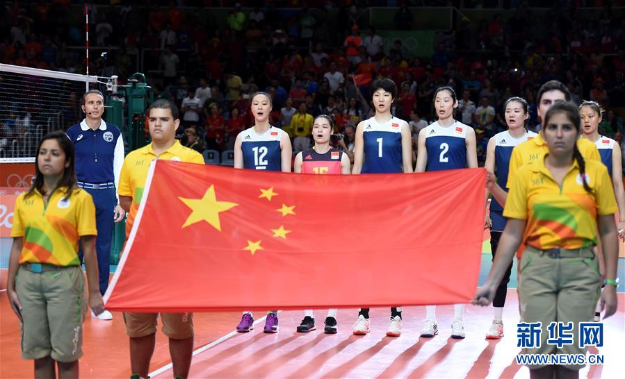 8月18日,中国队球员在赛前唱国歌。 当日,在2016年里约奥运会女子排球半决赛中,中国队对阵荷兰队。 新华社记者岳月伟摄