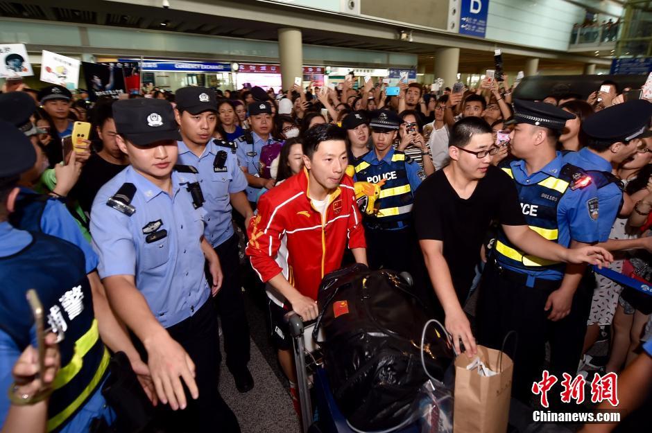 8月20日,包揽里约奥运4枚金牌的中国乒乓球队抵达首都机场,受到球迷的热情追捧。图为马龙出现在首都机场,被大批媒体和球迷包围。中新网记者 金硕 摄