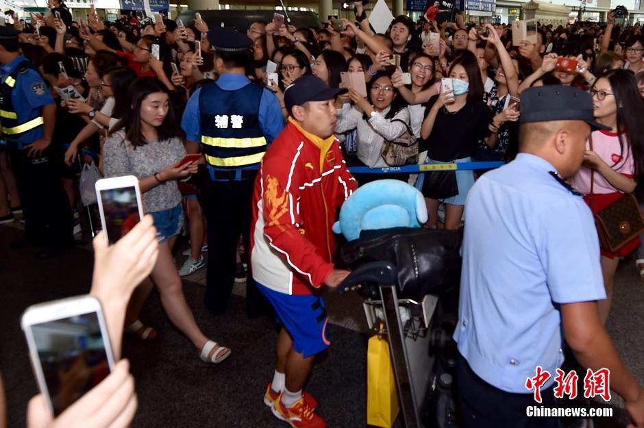 8月20日,包揽里约奥运4枚金牌的中国乒乓球队抵达首都机场,受到球迷的热情追捧。图为刘国梁出现在首都机场,被大批媒体和球迷包围。中新网记者 金硕 摄