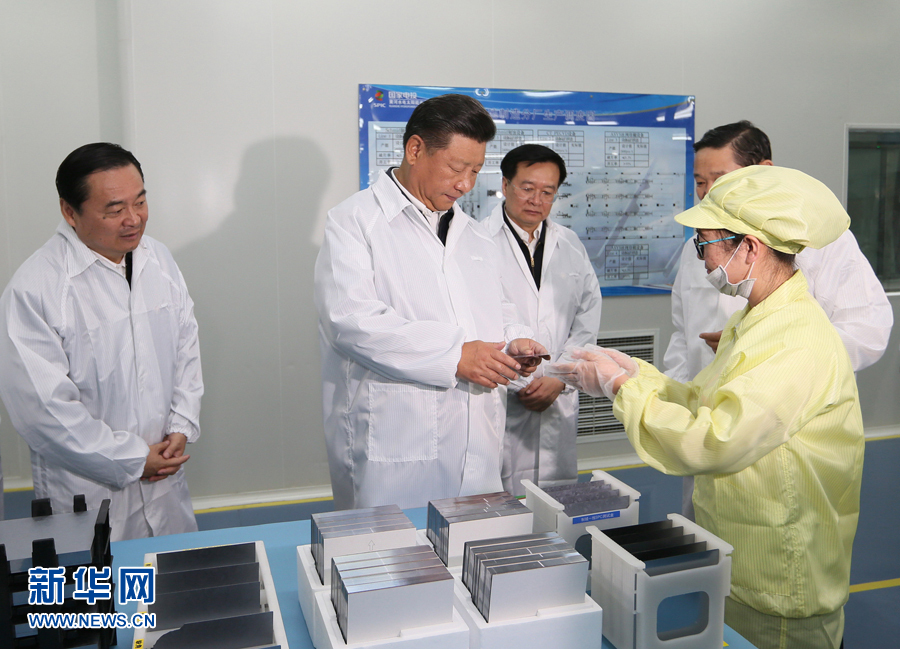 这是8月23日下午,习近平在国家电投黄河水电太阳能电力有限公司西宁分公司太阳能电池生产车间考察。 新华社记者 兰红光 摄