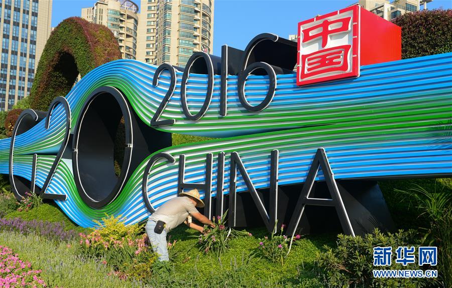 8月25日,园艺工人在杭州市滨江区江南大道街头维护G20主题花坛。二十国集团(G20)领导人第十一次峰会将于9月4日至5日在浙江省杭州市举行。 新华社记者尹栋逊摄
