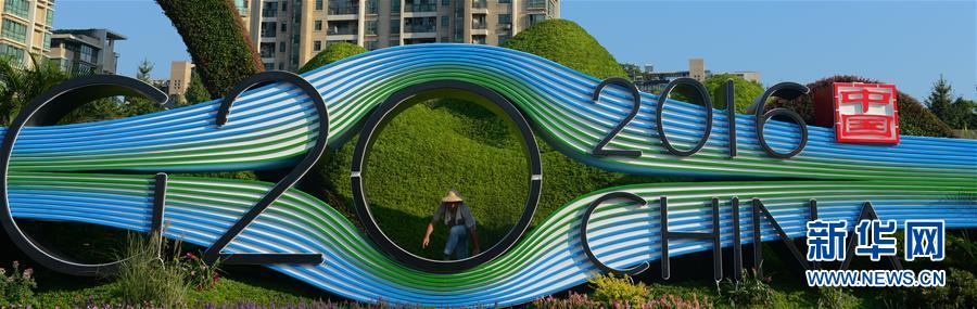 8月25日,园艺工人在杭州市滨江区江南大道街头维护G20主题花坛。二十国集团(G20)领导人第十一次峰会将于9月4日至5日在浙江省杭州市举行。 新华社记者尹栋逊摄