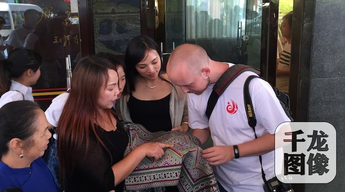 侗族织女展示手中的侗锦,吸引了外国记者的注意。侗锦织造工序复杂,慢工出细活,一位织娘一天只能织出两三寸。而图中展示的桌旗大约1.7米长,需要一位织娘花费2个月的时间才能完成。千龙网记者 包萌 摄