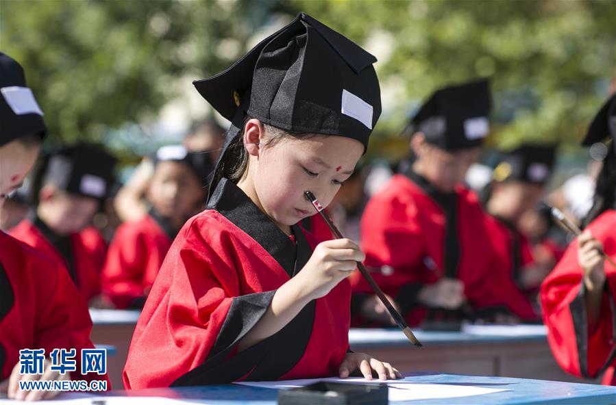 当日,河北省邢台市桥西区行知小学举行汉服开笔礼仪式,200多名新入学的一年级学生身着汉服,在老师的带领下通过“开笔启蒙”“击鼓鸣志”等环节体验中国古代传统文化。新华社记者 牟宇 摄