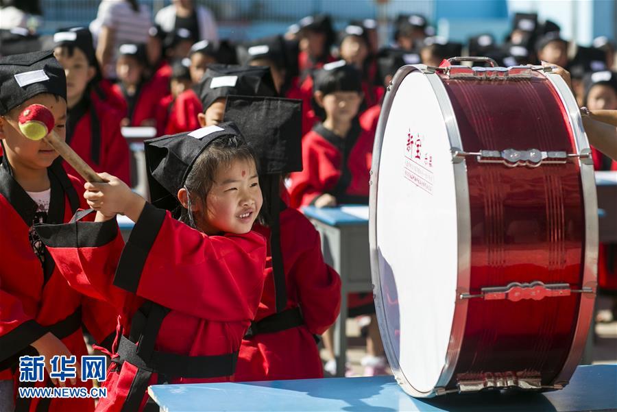 8月31日,邢台市桥西区行知小学的学生在“击鼓鸣志”。新华社记者 牟宇 摄