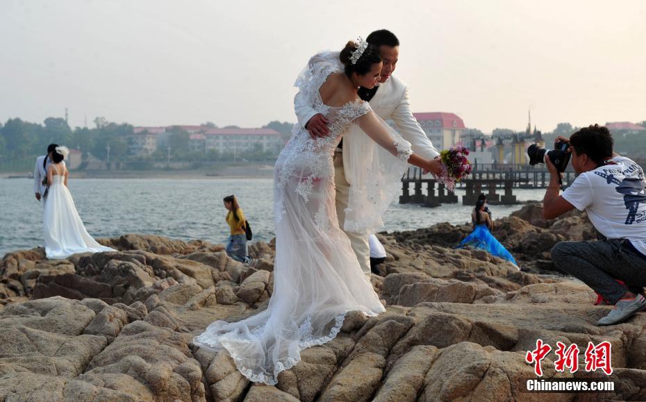 9月5日下午,位于河北省秦皇岛市北戴河的碧螺塔公园,奇特的礁石上一对对新人在这里拍摄婚纱照。这里每年都会吸引全国各地的新人前来拍摄婚纱照。 中新社记者 翟羽佳 摄