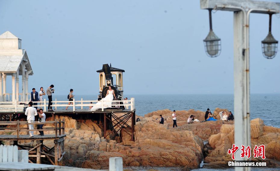 9月5日下午,位于河北省秦皇岛市北戴河的碧螺塔公园,奇特的礁石上一对对新人在这里拍摄婚纱照。这里每年都会吸引全国各地的新人前来拍摄婚纱照。 中新社记者 翟羽佳 摄