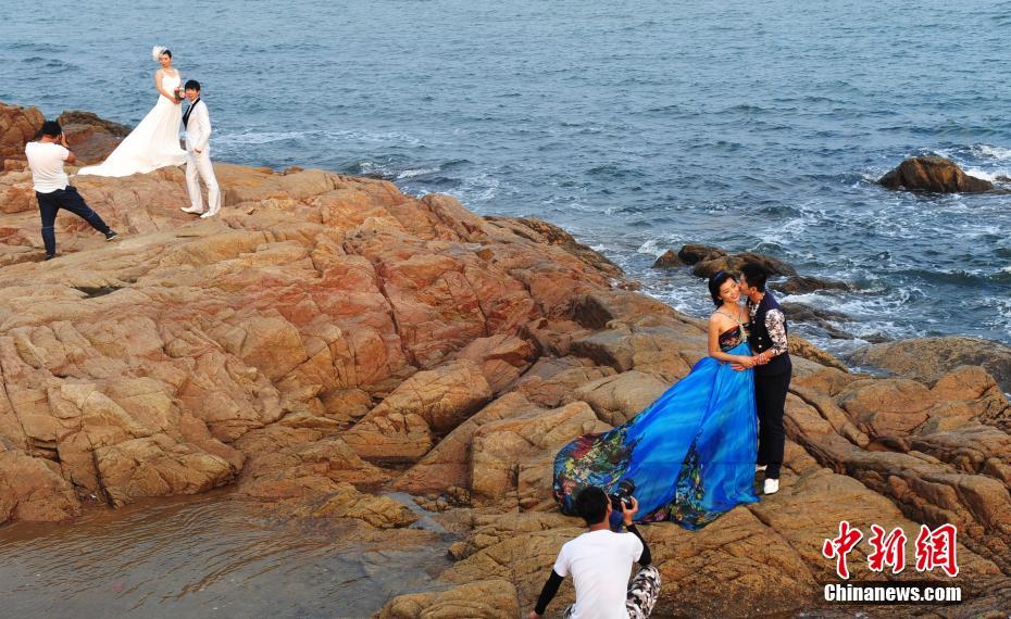 9月5日下午,位于河北省秦皇岛市北戴河的碧螺塔公园,奇特的礁石上一对对新人在这里拍摄婚纱照。这里每年都会吸引全国各地的新人前来拍摄婚纱照。 中新社记者 翟羽佳 摄