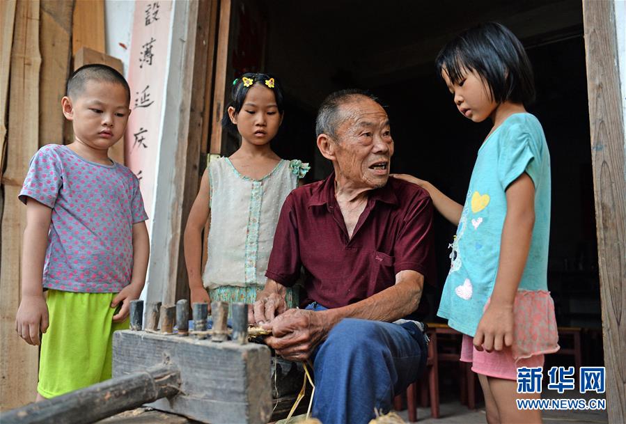 在江西省于都县罗坳镇,老人陈罗寿(右二)一边打草鞋,一边给孩子们讲长征的故事(8月11日摄)。 82年前,中央红军主力及中央、军委机关8.6万余人在江西省于都县集结出发,这给赣南小城烙下了难以磨灭的印记。亲人要出远门,打双草鞋送他们上路,是当年苏区群众最热忱的方式。这是长征出发集结地的又一幅历史画面:家家户户打草鞋,母亲做给儿子、妻子做给丈夫、未婚妻做给情郎……更多的苏区群众背着打好的草鞋赶到于都河边,把草鞋送给途经的战士。十月的于都河畔,红军战士就是穿着一双双苏区群众亲手编织的草鞋,踏上战略转移的伟大征程。新华社记者 万象 摄