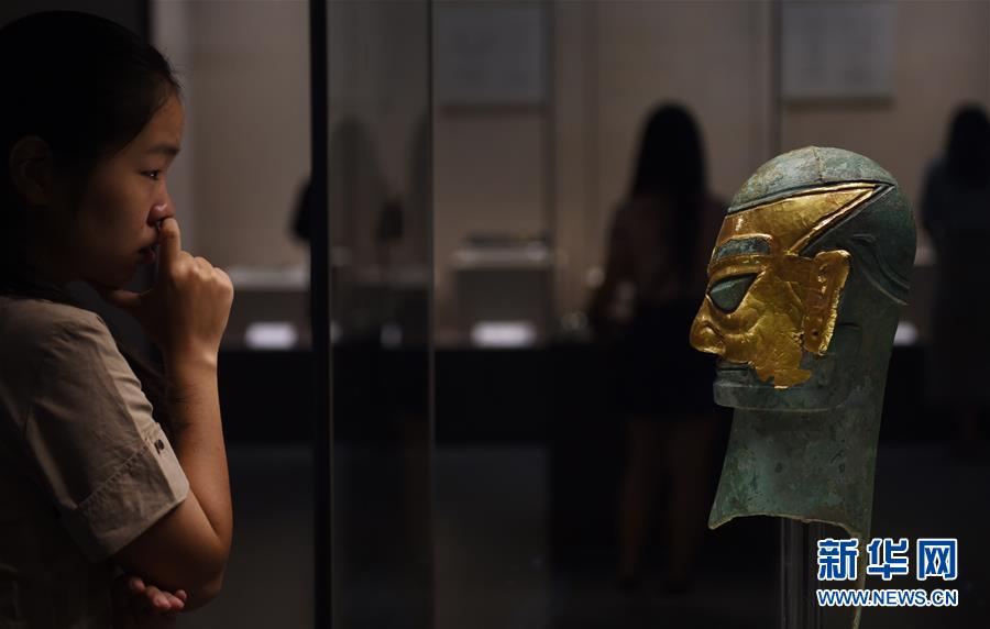 9月20日,一位女士在长沙博物馆参观出土于三星堆遗址的商代戴金面罩青铜人头像。当日,“神秘的古蜀王国——三星堆和金沙遗址出土文物精华展”在长沙博物馆正式向公众免费开展,展览展出的137件文物出土于三星堆遗址和成都金沙遗址,集结了四川广汉三星堆博物馆、成都金沙遗址博物馆两馆的文物精华,包括青铜纵目大面具、戴金面罩青铜人头像、铜太阳形器在内的一批重要文物再现了辉煌璀璨的古蜀文化。据悉,本次展览将持续到12月20日。新华社记者 李尕 摄