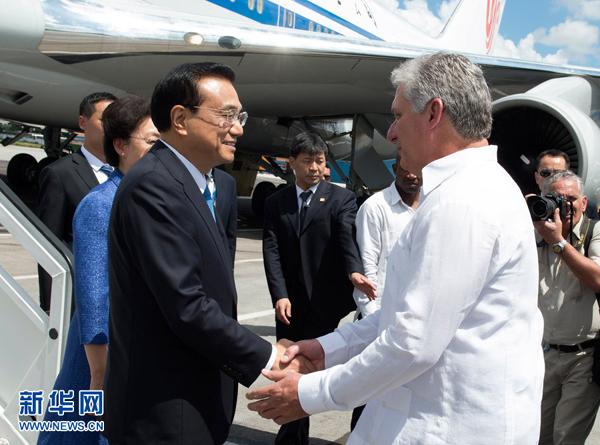当地时间9月24日下午,应古巴国务委员会主席兼部长会议主席劳尔·卡斯特罗邀请,国务院总理李克强乘专机抵达哈瓦那何塞·马蒂国际机场,开始对古巴进行正式访问。李克强总理夫人程虹同机抵达。古巴国务委员会第一副主席兼部长会议第一副主席迪亚斯-卡内尔等政府高级官员到机场迎接。新华社记者 黄敬文 摄