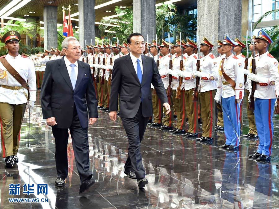 当地时间9月24日,国务院总理李克强在哈瓦那革命宫同古巴国务委员会主席兼部长会议主席劳尔·卡斯特罗举行会谈。会谈前,劳尔·卡斯特罗在革命宫为李克强举行隆重的欢迎仪式。新华社记者 李涛 摄