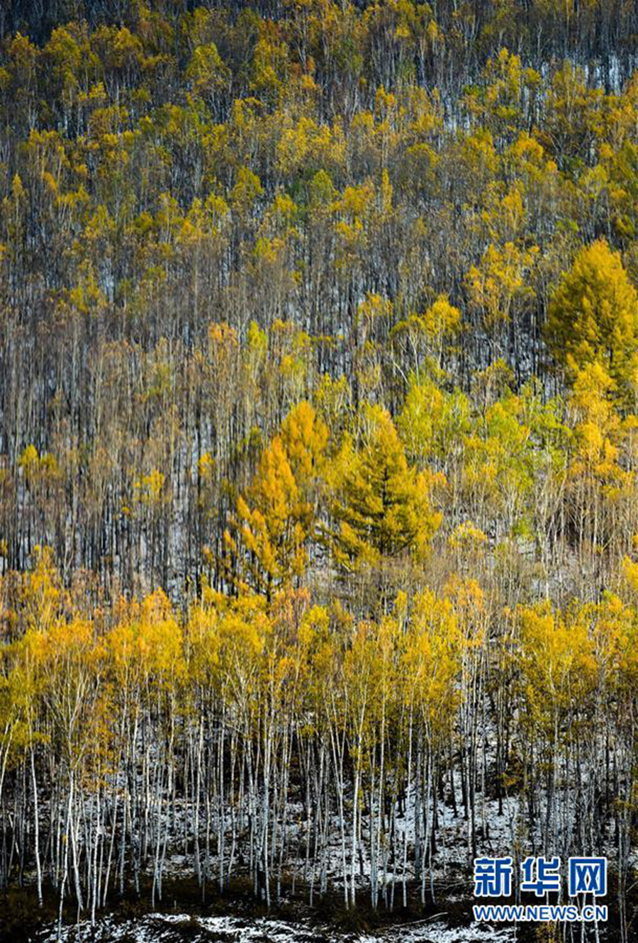 这是内蒙古阿尔山雪后的白桦林(9月27日摄)。阿尔山位于内蒙古大兴安岭西南山麓,这里东邻扎兰屯,北接呼伦贝尔草原,西与蒙古国接壤。火山熔岩地貌奇特,茂密的原始森林绵延不绝,四季鲜明,景色各异。目前,阿尔山气温已降至零摄氏度左右,白雪覆盖下的群山与金色的松林绘就了一幅美妙的深秋画卷,令人沉醉。新华社记者 连振 摄
