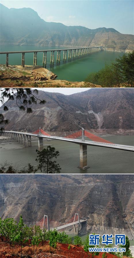 雅西高速瀑布沟库区路段3座跨大渡河特大桥:青杠嘴特大桥(上图)、观音岩特大桥(中图)、苏村坝特大桥(下图,拼版照片,摄于2012年4月12日)。1935年5月24日、25日间,红军“十七勇士”在枪林弹雨中,以一条木船强行从安顺场渡河,在国民党军视为天险的大渡河防线上,撕开了一个缺口,为红军沿大渡河两岸夹河北上夺占泸定桥创造了有利条件。 新华社记者江宏景摄