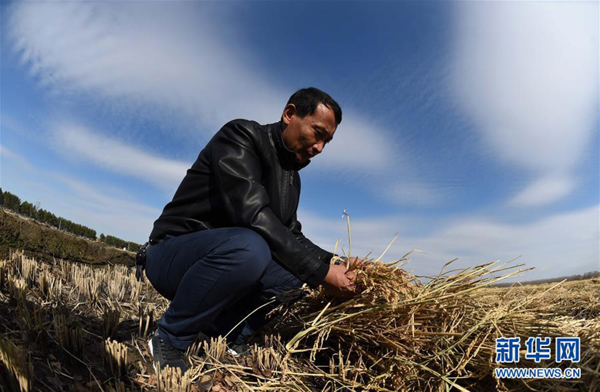 10月10日,黑龙江省大兴农场第七管理区负责人杨国利在查看水稻割晒降水情况。新华社记者 王建威 摄