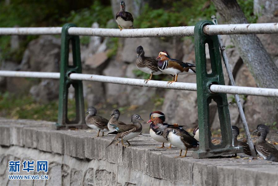 10月18日在哈尔滨兆麟公园拍摄的鸳鸯。每年10月末是鸳鸯南飞的日子,在黑龙江哈尔滨兆麟公园,近百只鸳鸯在公园内的鸳鸯湖等待南飞。 新华社记者 王凯 摄
