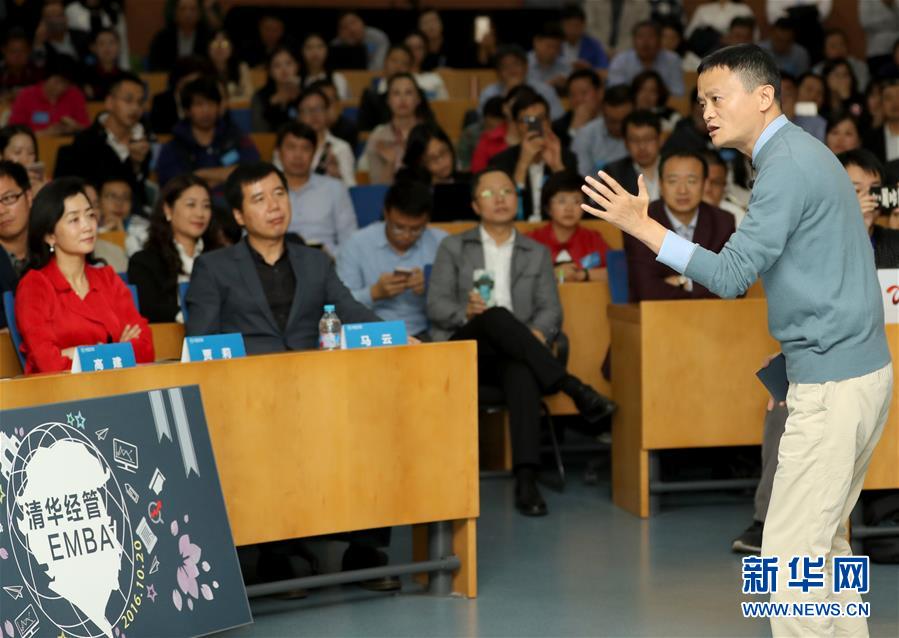 10月20日,阿里巴巴集团董事局主席马云在清华大学经管学院舜德楼演讲。当日,阿里巴巴集团董事局主席马云作为清华大学经济管理学院顾问委员会委员,在走进清华经管EMBA课堂活动中,发表了题为“企业家精神与未来”的主题演讲。现场数百名清华经管EMBA学生与马云进行了深入交流。新华社记者 陈建力 摄