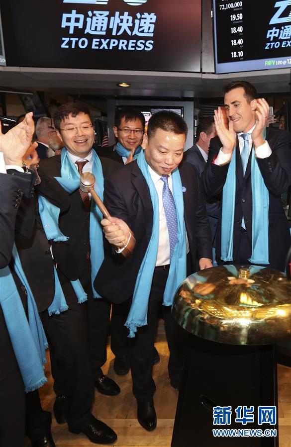 10月27日,在美国纽约证券交易所,中通快递创始人、董事长赖梅松(前右二)敲钟庆祝中通快递完成第一笔股票交易。中国中通快递27日正式在美国纽约证券交易所挂牌交易,成为继2014年阿里巴巴在美首次公开募股(IPO)之后最大规模的中国企业赴美融资案例,也是截至目前今年美国资本市场规模最大的IPO。新华社记者 王迎 摄