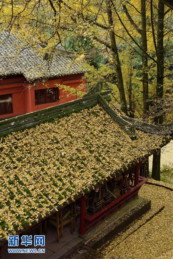 11月8日,银杏树落叶铺满天盖寺院。新华社记者江宏景 摄