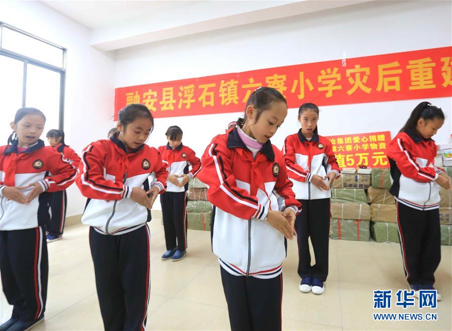 11月9日,六寮小学学生在新教室里跳舞。当日,广西融安县浮石镇六寮小学100多名师生搬进新校园。今年4月21日,六寮小学后山山体发生突发性岩崩地质灾害,造成学校教学楼受损严重,无法使用,融安县决定选新址建造一所全新的六寮小学。新华社记者 黄孝邦 摄