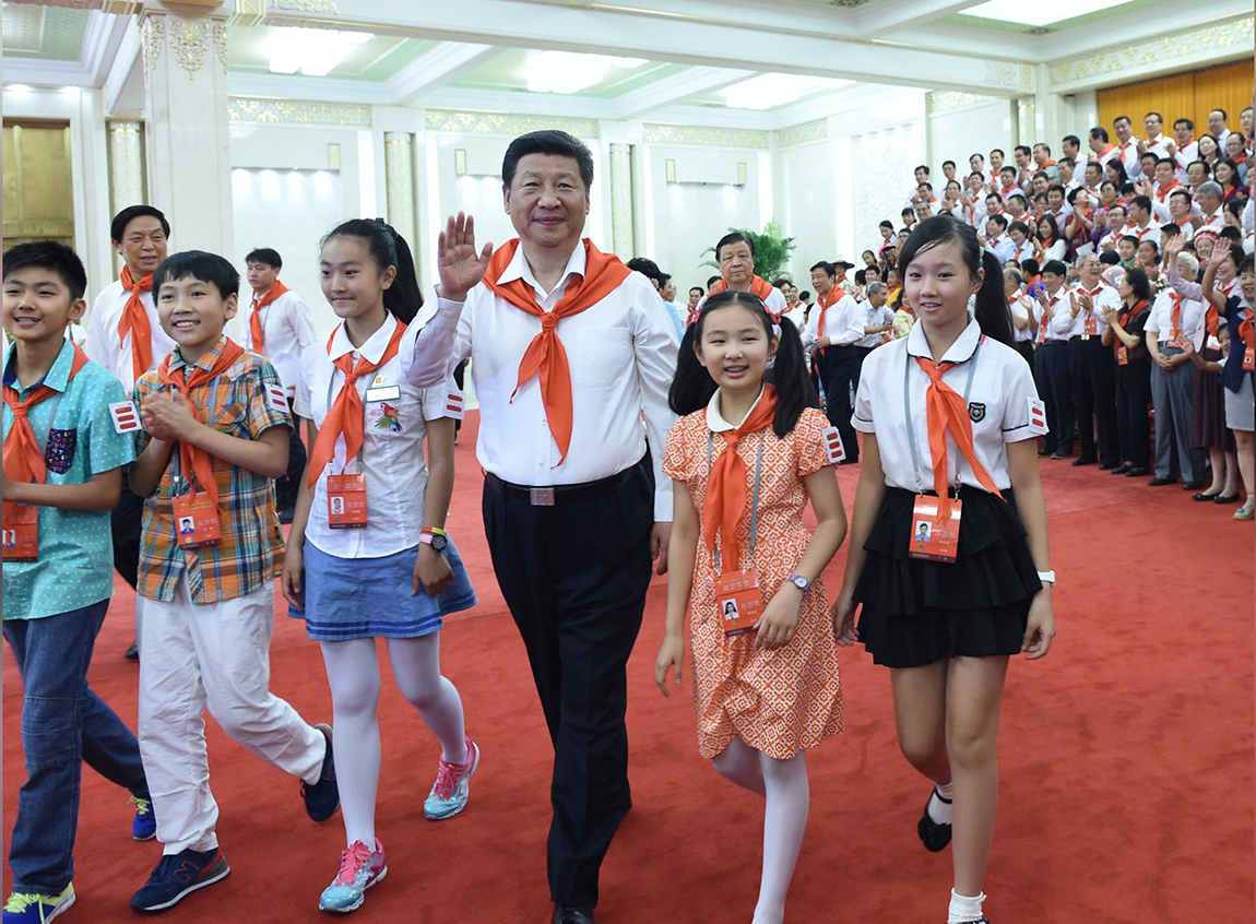 2015年6月1日,中国少年先锋队第七次全国代表大会在北京开幕。这是习近平、刘云山等来到人民大会堂,与代表们亲切握手,并合影留念。新华社记者王晔摄