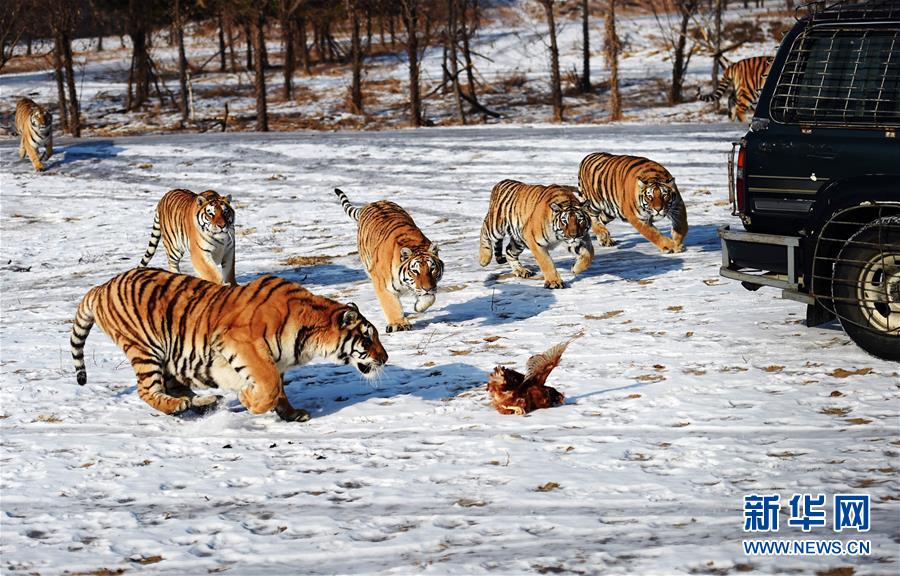 11月16日,在黑龙江东北虎林园散放区,一群东北虎在捕食活鸡。新华社记者王建威 摄