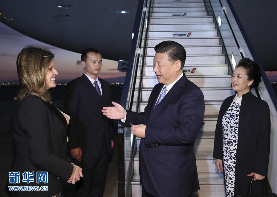 当地时间11月18日,国家主席习近平抵达利马,出席亚太经合组织第二十四次领导人非正式会议并对秘鲁共和国进行国事访问。习近平和夫人彭丽媛受到秘鲁副总统阿劳斯等热情迎接。新华社记者 兰红光 摄