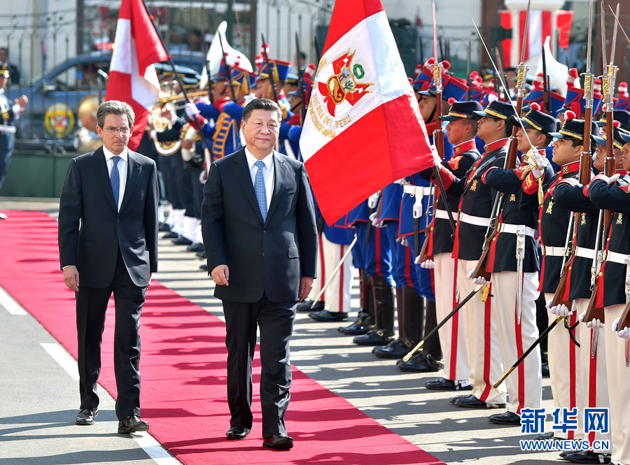 11月21日,国家主席习近平在利马会见秘鲁国会主席萨尔加多。习近平抵达国会时,军乐队奏欢迎曲。习近平检阅仪仗队。 新华社记者 李涛 摄