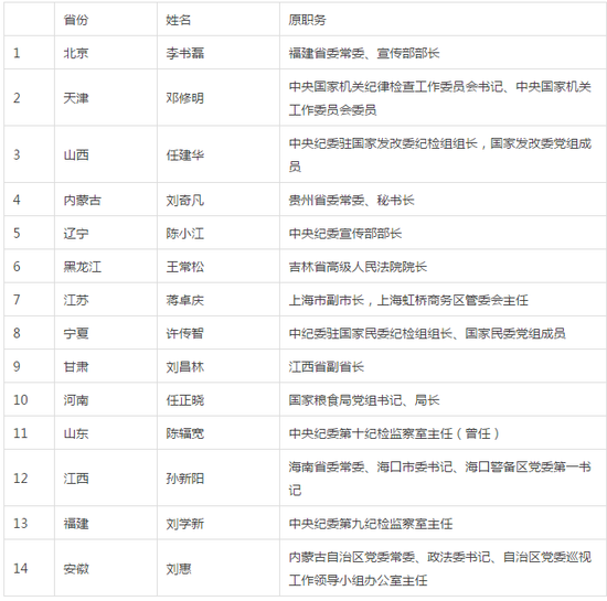 观海解局根据公开报道梳理发现,今年以来,至少已经有14个省份换了省级纪委书记,分别为北京、天津、山西、内蒙古、辽宁、黑龙江、江苏、安徽、福建、江西、山东、河南、甘肃和宁夏。