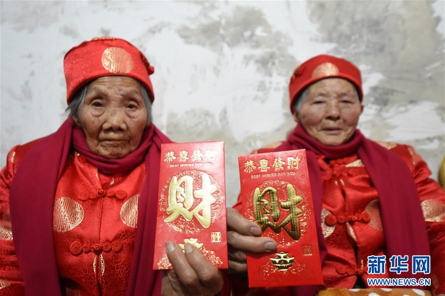 12月19日,两位百岁老人在团年活动上展示乡亲送来的红包。新华社记者 唐奕摄