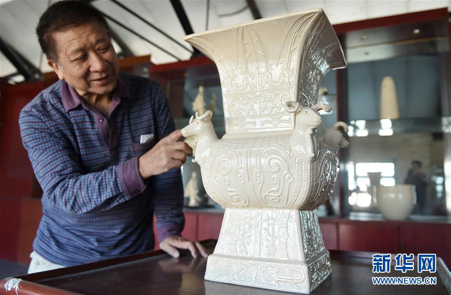 漳窑瓷传统制作技艺传承人林俊在介绍用漳窑传统技艺烧制的米黄釉《四羊方尊》(12月27日摄)。