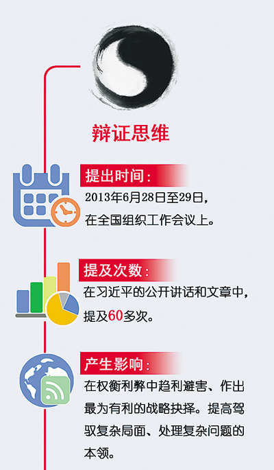辩证思维是习近平总书记强调的重要思维方法。在公开场合,习近平对辩证思维的阐述达60多次。而且,习近平辩证思维的一个重要特点是“战略辩证”,即用辩证思维来把握战略谋划,“作出最为有利的战略抉择”。