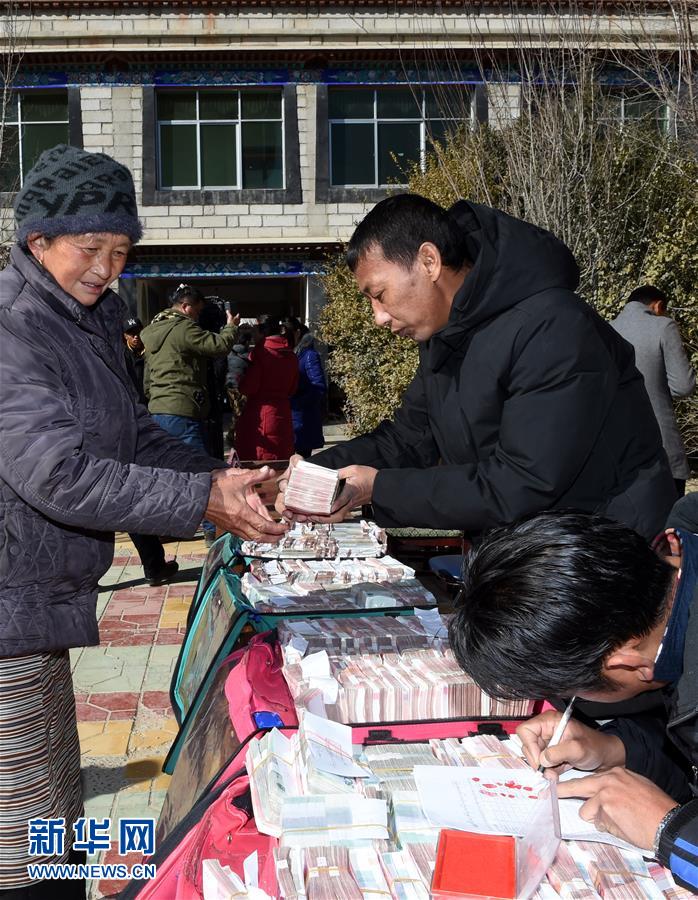 1月5日,拉萨娘热乡农民在领取分红。当日,拉萨市城关区娘热乡三个村的藏族农民聚在一起进行集体经济收益分红,让村民可以过上一个红火的春节和藏历新年。娘热乡属于拉萨城郊农村,近年来利用靠近城市的有利条件,办起宾馆、汽车修理和出租房等发展集体经济。新华社记者 觉果 摄
