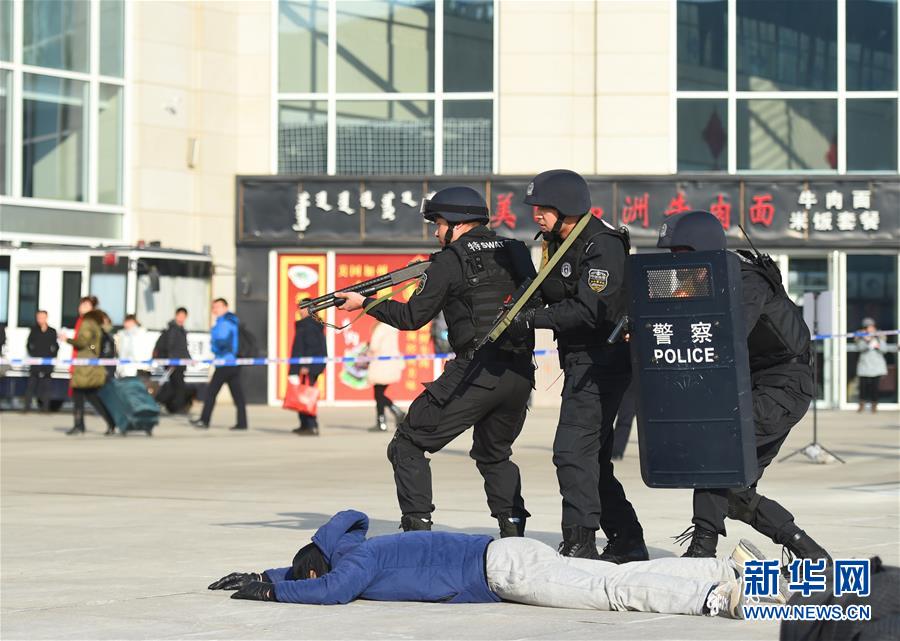 1月11日,呼和浩特铁路公安处特警支队队员在进行反恐处突演练。当日,为保障春运期间旅客出行安全,呼和浩特铁路警方组织特警队员在内蒙古呼和浩特东火车站开展反恐防暴和应急处突演练。 新华社记者 邓华摄