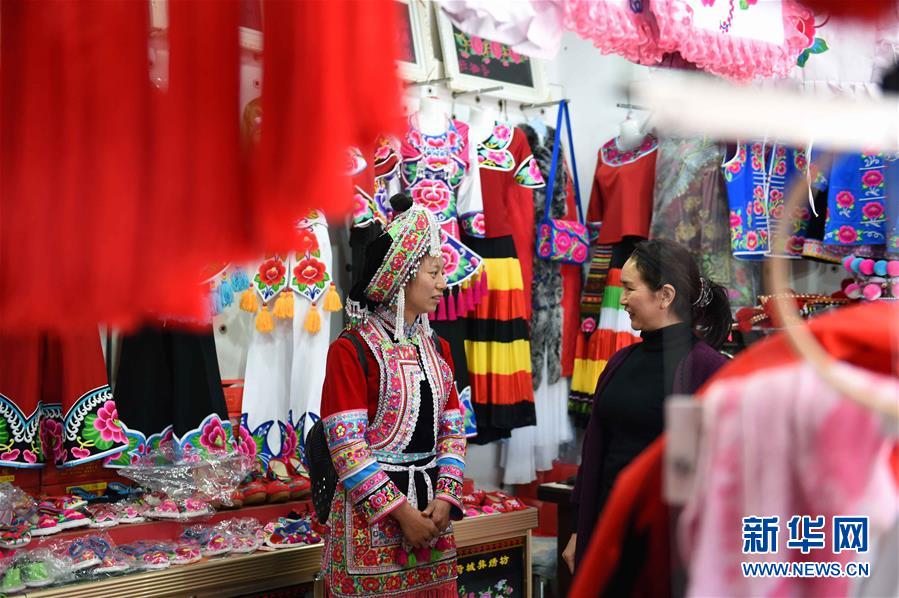 自贵菊(左)在云南姚安县彝族绣品店了解销售情况(2月23日摄)。 2017年全国两会开幕在即,十二届全国人大代表、云南省楚雄彝族自治州姚安县官屯镇马游村农民自贵菊忙着在基层调研。自贵菊所在的马游村平均海拔2500多米,是典型的高寒贫困山区,生态环境脆弱,经济作物缺乏,目前仍有169户贫困户。自贵菊在长期的摸索中,找到了适合彝族村寨脱贫增收的路子——发展养殖业和彝族刺绣产业。自贵菊和丈夫已有十几年的养殖经验,在她的带动下,近年来村里已经有几十户村民也加入个体养殖的行业。作为马游村民族刺绣协会会长,自贵菊带动村里53名妇女一起发展彝族刺绣产业,通过与公司合作,单靠彝族刺绣一项,每人每年能创收一万元左右。自贵菊说,以前我做刺绣,是为了自己穿得漂亮些,而现在是为了带动村里的妇女增加收入,传承彝族刺绣,把我们的刺绣产品传播到全国各地去。十二届全国人大五次会议期间,自贵菊准备建议国家对云南边疆民族贫困地区的特色产业从项目资金、培训等方面加大扶持力度。 新华社记者杨宗友摄