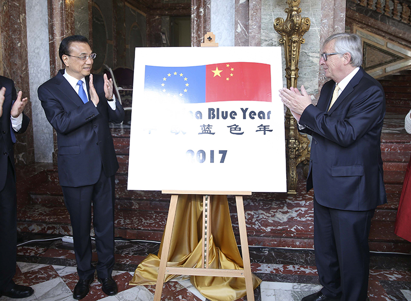 当地时间2日上午,李克强总理与欧盟委员会主席容克在布鲁塞尔的埃格蒙宫,共同为中欧“旅游年”和中欧“蓝色年”标识揭牌。经双方商定,2017年为中欧“蓝色年”,双方将深化海洋领域研究合作,2018年则为中欧“旅游年”。