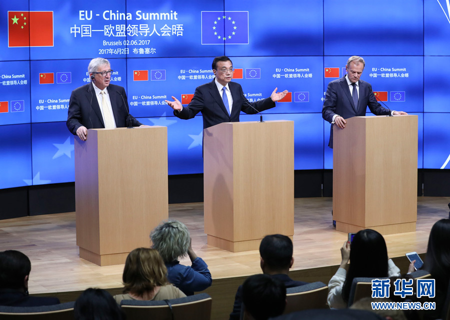 当地时间6月2日下午,国务院总理李克强同欧洲理事会主席图斯克、欧盟委员会主席容克共同会见记者,介绍第十九次中国-欧盟领导人会晤成果。新华社记者 谢环驰 摄