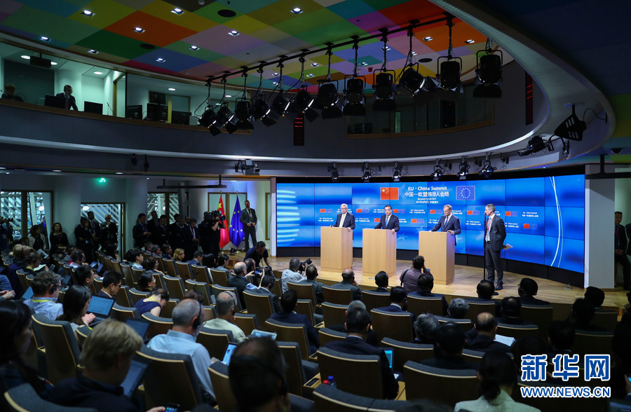 当地时间6月2日下午,国务院总理李克强同欧洲理事会主席图斯克、欧盟委员会主席容克共同会见记者,介绍第十九次中国-欧盟领导人会晤成果。新华社记者 谢环驰 摄