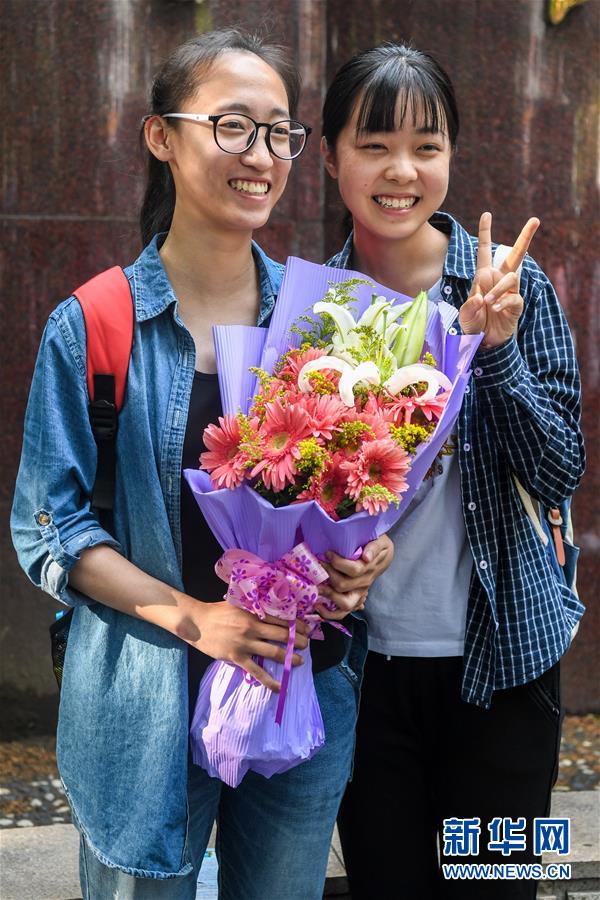 6月8日,在河南省郑州市回民中学考点,两名走出考场的考生合影留念。