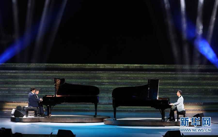 6月30日,庆祝香港回归祖国二十周年文艺晚会在香港会展中心举行。这是郎朗(左一)、甄子丹(右)、梁俊晟在演奏《黄河船夫曲》。 新华社记者 王晔 摄