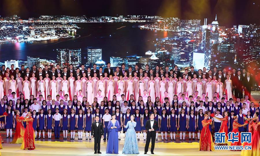 6月30日,庆祝香港回归祖国二十周年文艺晚会在香港会展中心举行。这是演员在演唱歌曲《天耀中华》。 新华社记者 王晔 摄