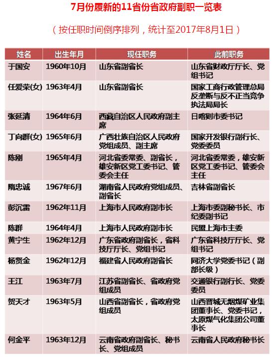 中国共产党新闻网北京8月2日电 (记者 姚茜)近日,地方省级政府副职调整频繁。据中国共产党新闻网记者统计,7月份,共有11省份13名省政府副职履新,他们是云南省副省长何金平,山西省副省长贺天才,江苏省副省长王江,福建省副省长杨贤金,广东省副省长黄宁生,上海市副市长彭沉雷、陈群,湖南省副省长隋忠诚,河北省副省长陈刚,广西壮族自治区副主席丁向群,西藏自治区副主席张延清和山东省副省长于国安、任爱荣。