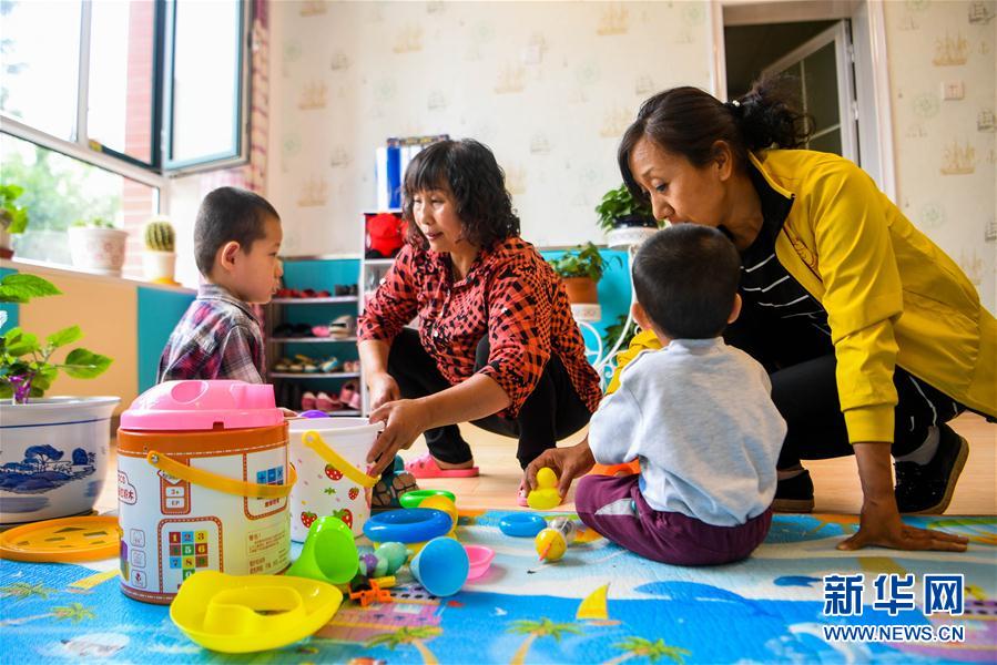 在呼和浩特儿童福利院,社会爱心人士景凤英(左二)在陪孤残儿童玩耍(9月14日摄)。