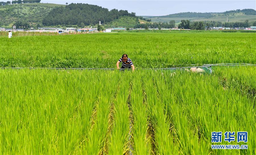 吉林省延边州和龙市东城镇光东村水稻种植大户林忠奎在田间查看水稻长势(8月1日摄)。